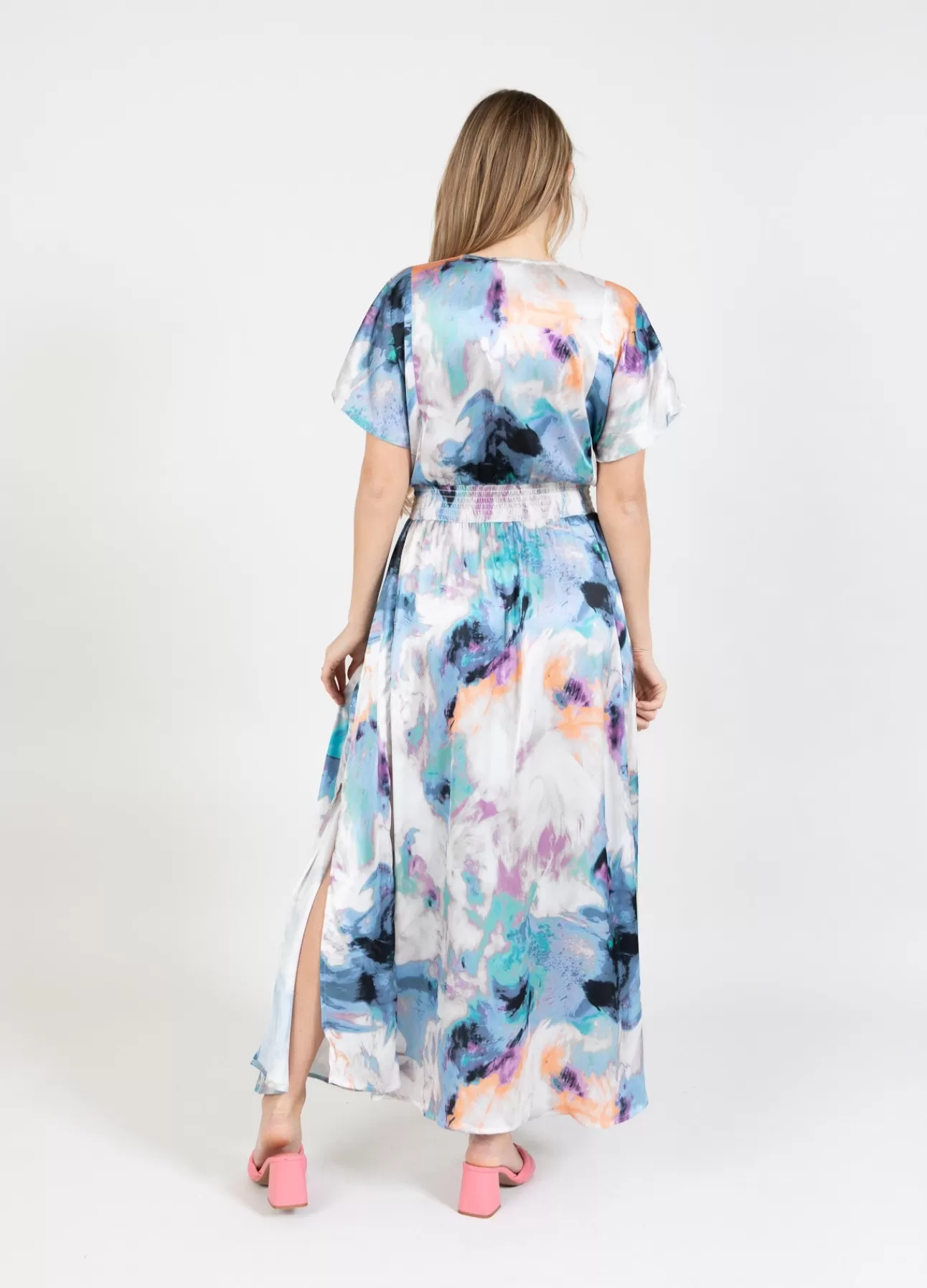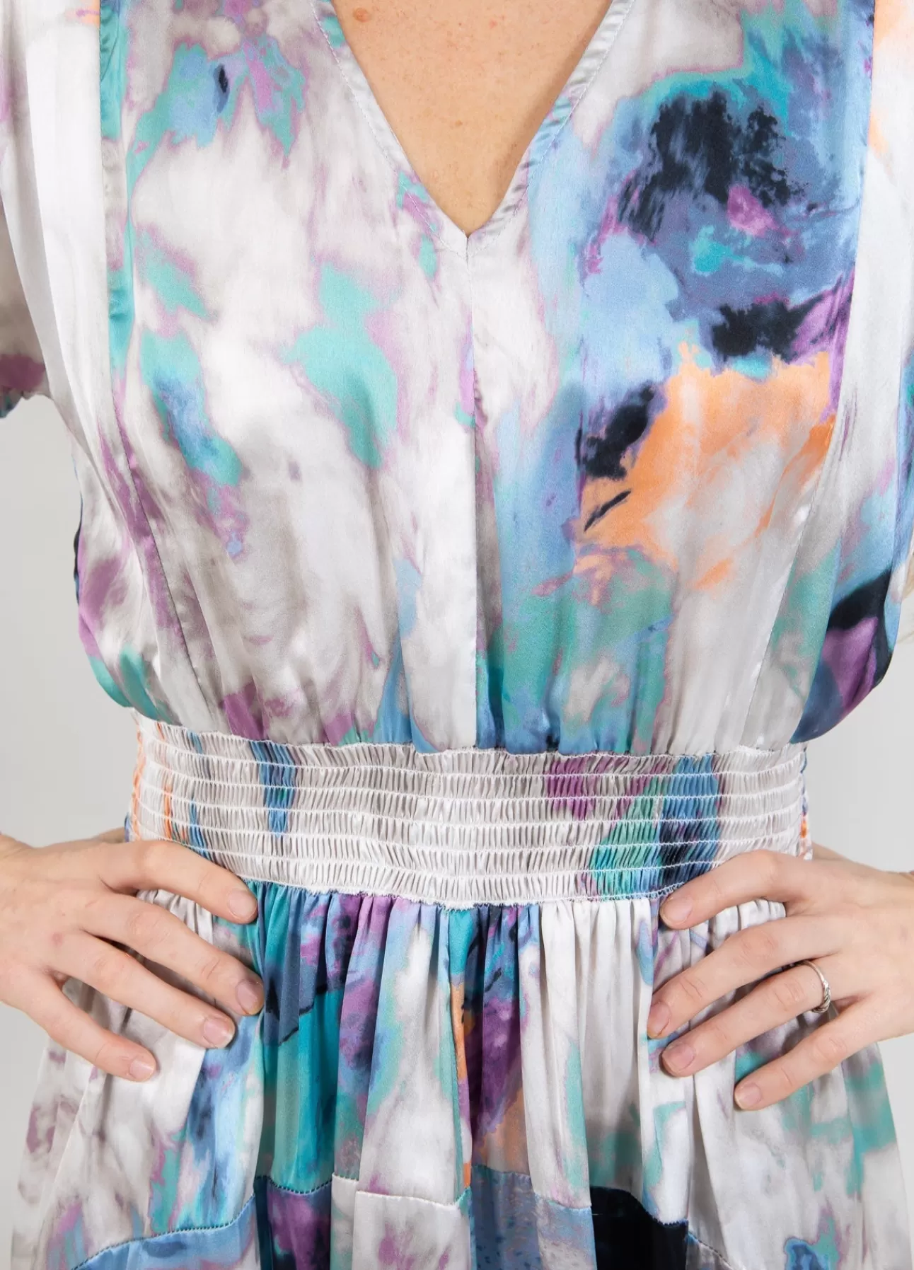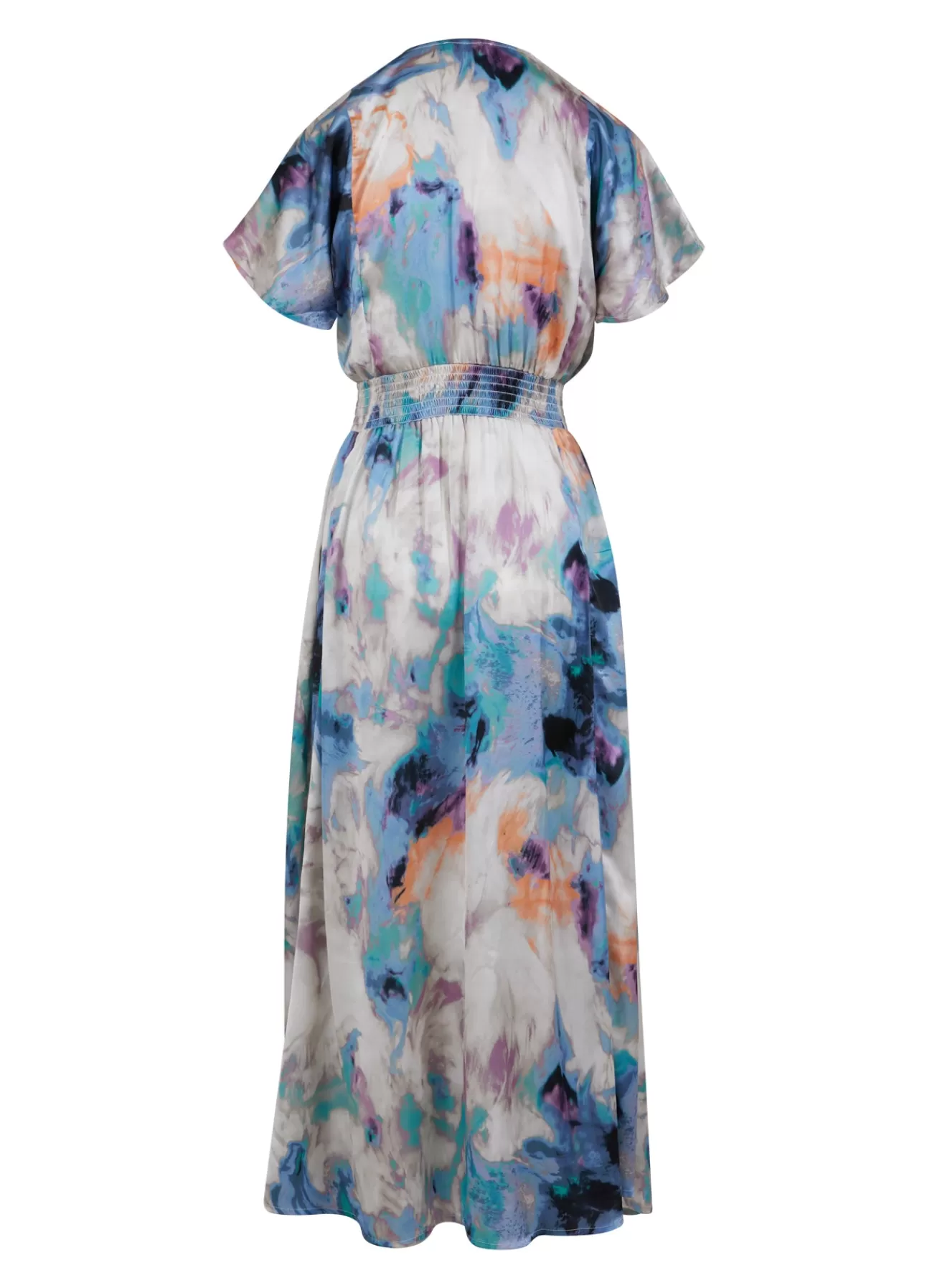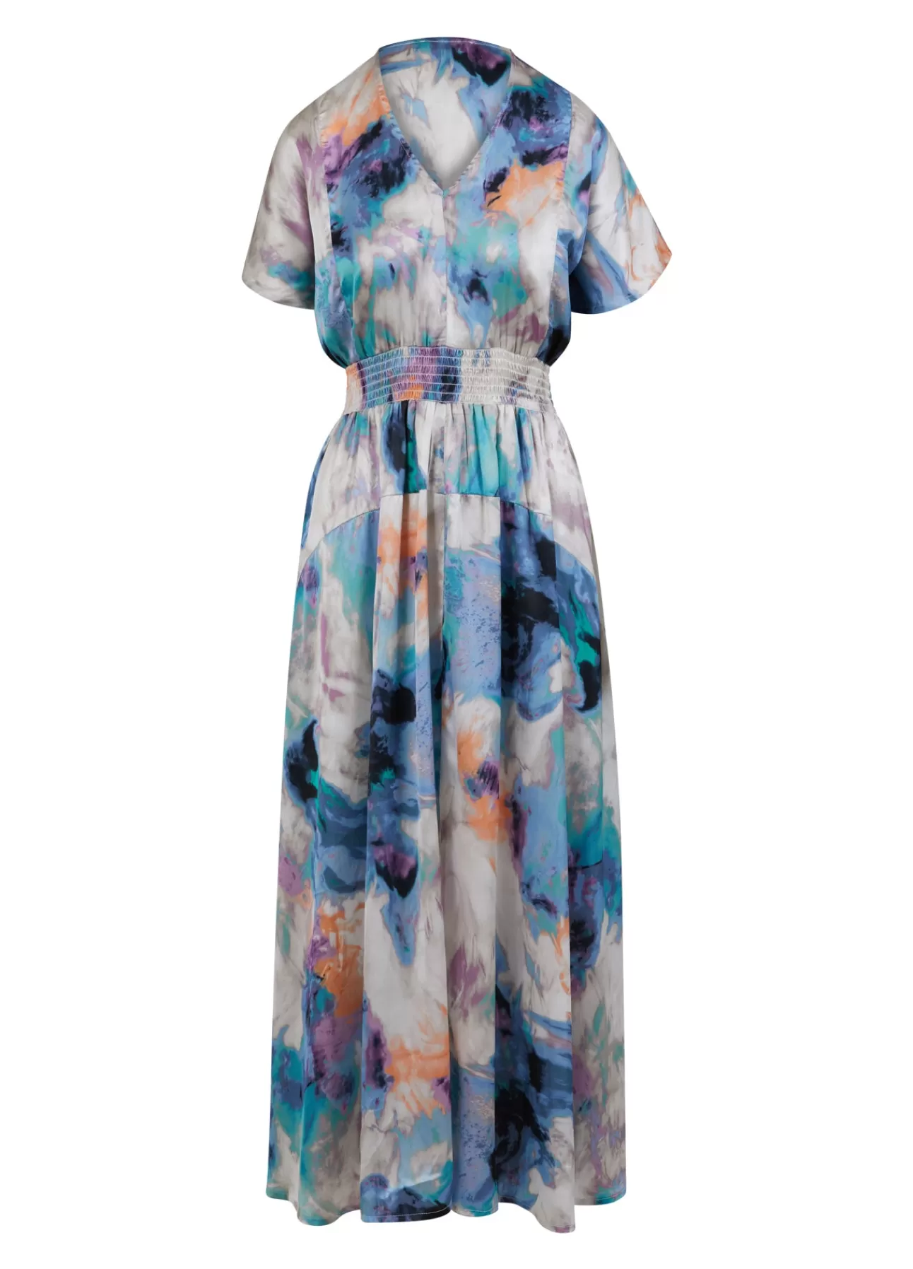 Klänningen har en smickrande V-ringning som betonar dekolletage med en touch av kvinnlighet. Den rynkade, elastiska midjan ger en bekväm passform och accentuerar midjan på ett smickrande sätt. Med sin ankellängd ger denna klänning en sofistikerad och elegant look. Den är lämplig för både sommar och höst och kan kombineras med både sandaler och stövlar.